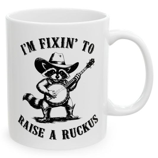 I'm Fixin' To Raise A Ruckus Funny Western Raccoon Sarcastic 11oz Unique Coffee Cup Mug