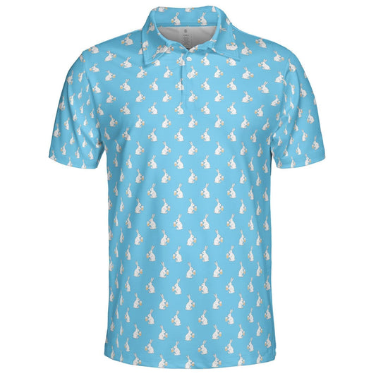 Blue Easter Bunny Polo Golf Shirt for Men Festive Rabbit Print Moisture Wicking Short Sleeve Top