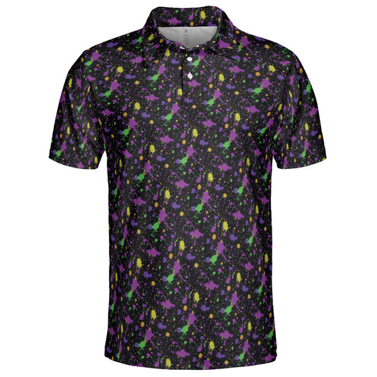 Mardi Gras Polo Shirt for Men Purple Green Gold Paint Splatter Pattern Moisture Wicking Short Sleeve Golf