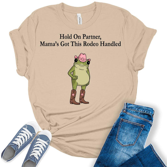 Women's Hold On Partner Funny Western Frog Shirts For Mom Graphic Tees Bella Plus Sized Tops