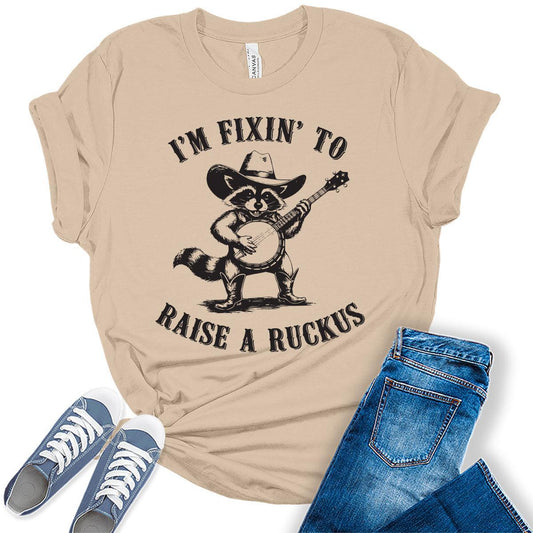 Women's Funny Raccoon Shirts For Teens Western Raise A Ruckus Graphic Tees Bella Plus Sized Tops