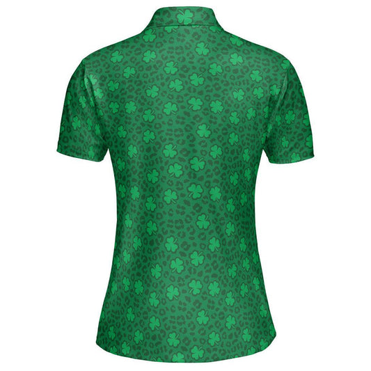 St Patrick's Day Polo Shirts for Women Leopard Print Clover Green Shirt Moisture Wicking Short Sleeve Golf Shirt