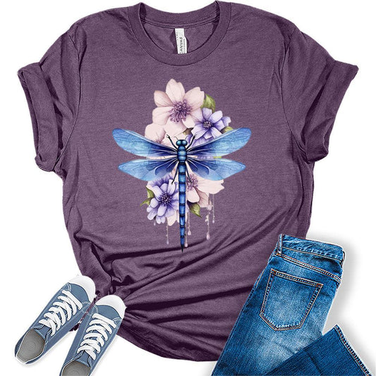 Women's Graphic Tees Casual Summer Dragonfly Shirt Watercolor Printed Short Sleeve Cute Casual Tops
