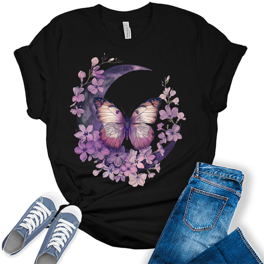 Butterfly Shirt Vintage Cottagecore Wildflowers T Shirt Trendy Moon Graphic Tees for Women