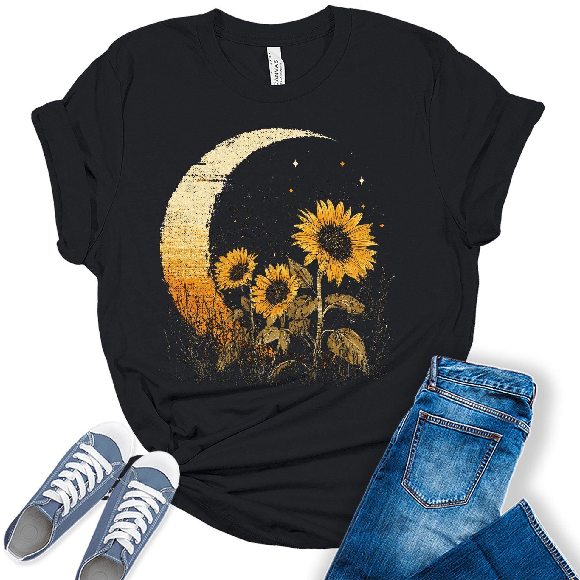 Vintage Sunflower Moon Shirt for Women Boho Graphic Tee Bella Short Sleeve Casual Top