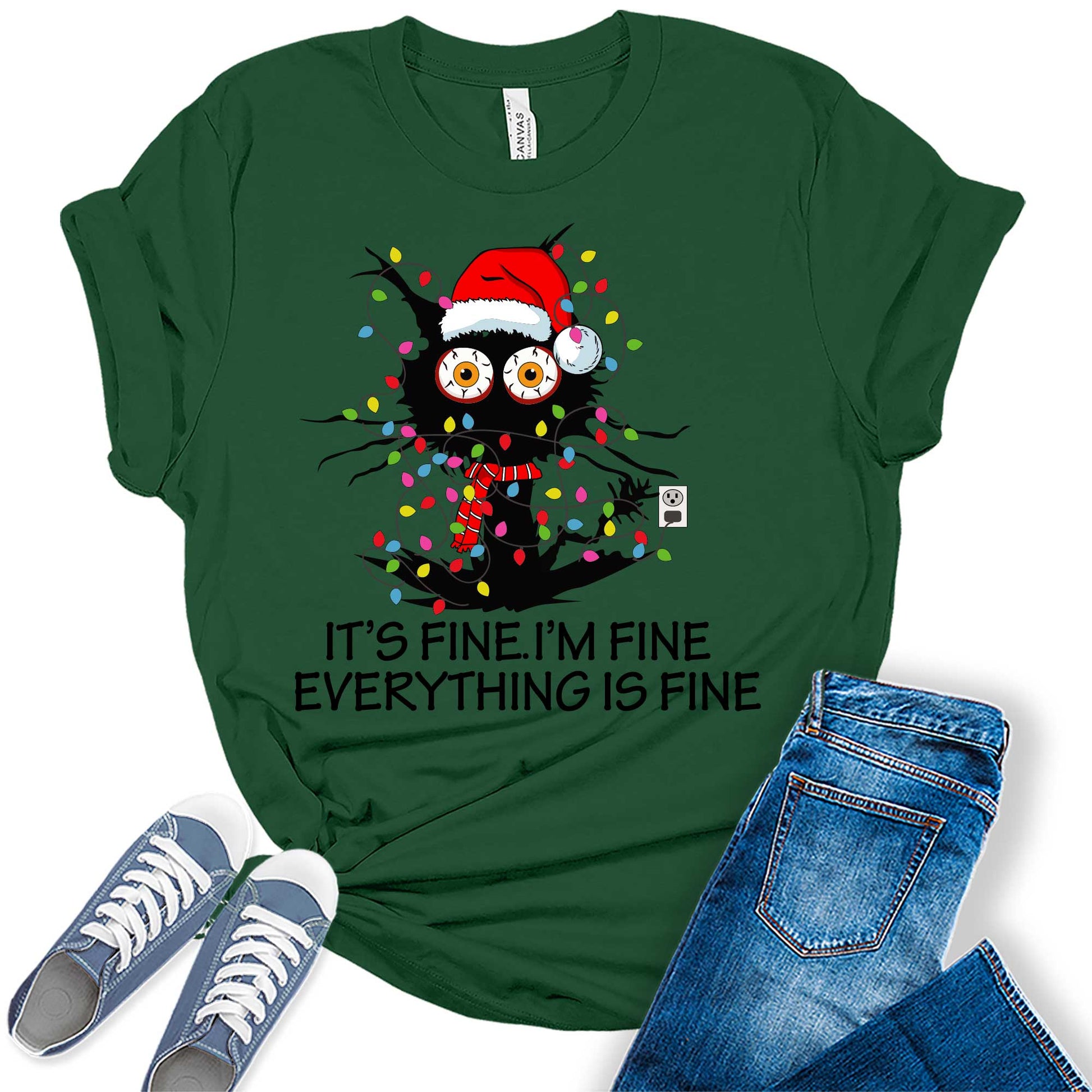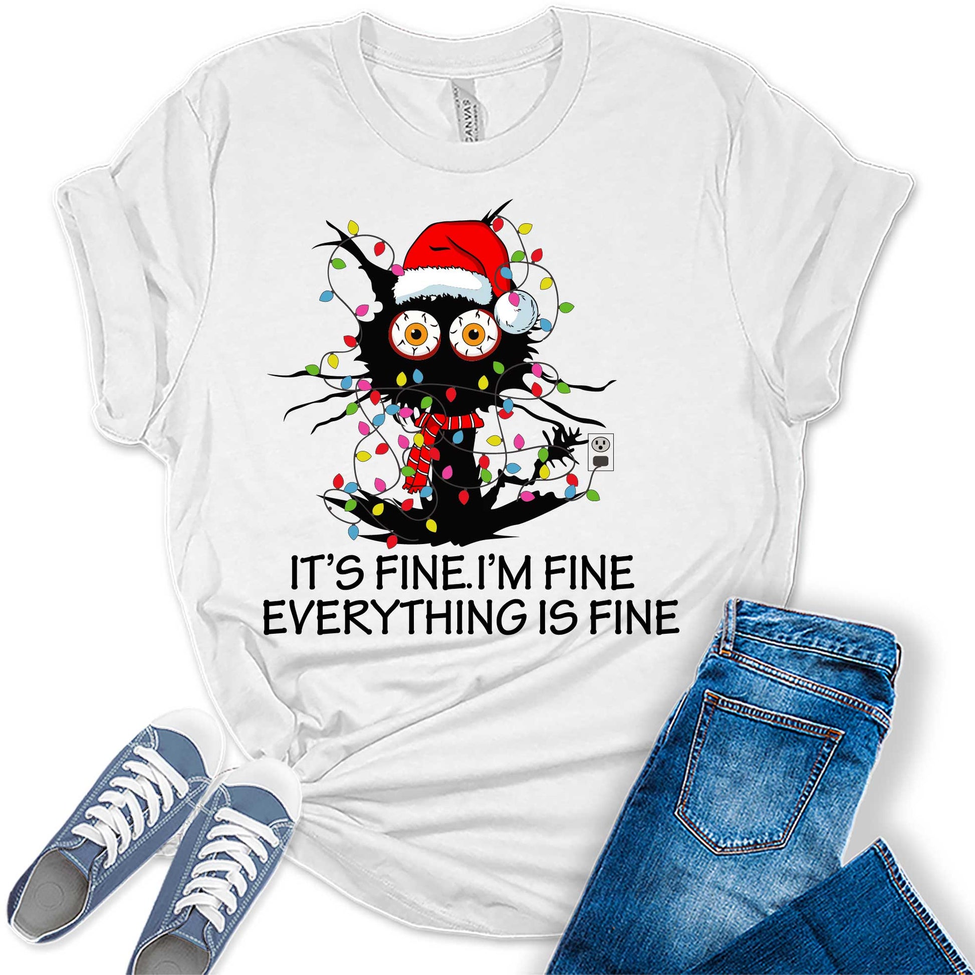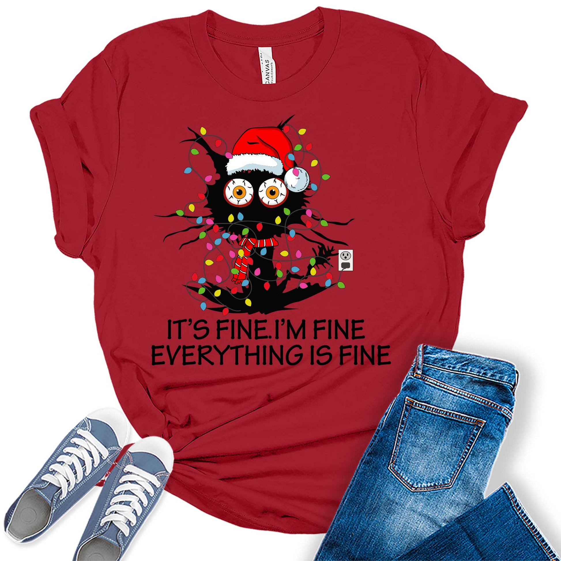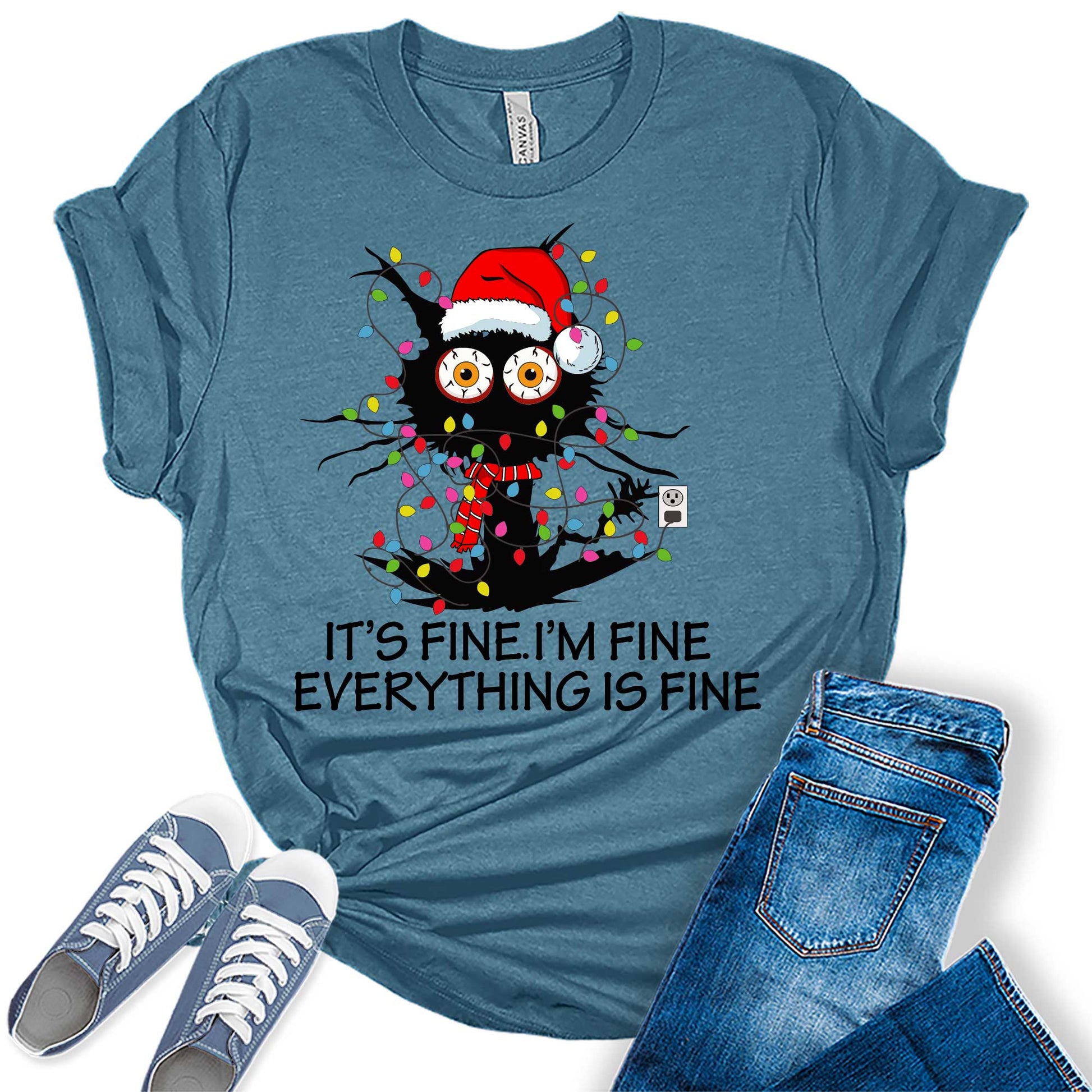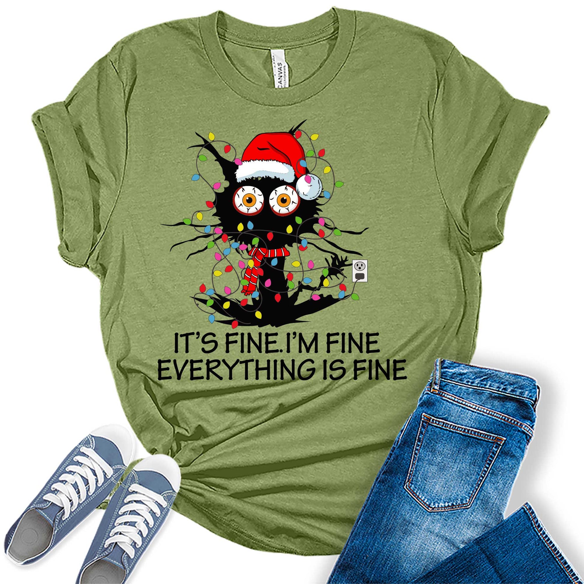 Women's Funny Christmas Shirt It's Fine I'm Fine Everything is Fine T Shirt Christmas Cat Holiday Graphic Tees